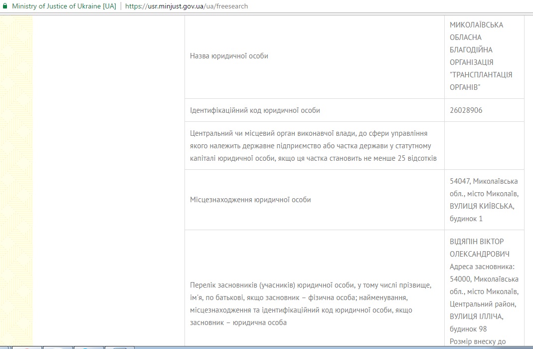 На противагу цим словам одразу ж нам надали відповідь на запит Інституту аналітики і адвокації, щодо роботи благодійного фонду «Трансплантація органів» (вих..03/01/3 від 03.12.2015), який має юридичну адресу ту ж саму, що і обласна лікарня і засновником якої є сам В.Відяпін.