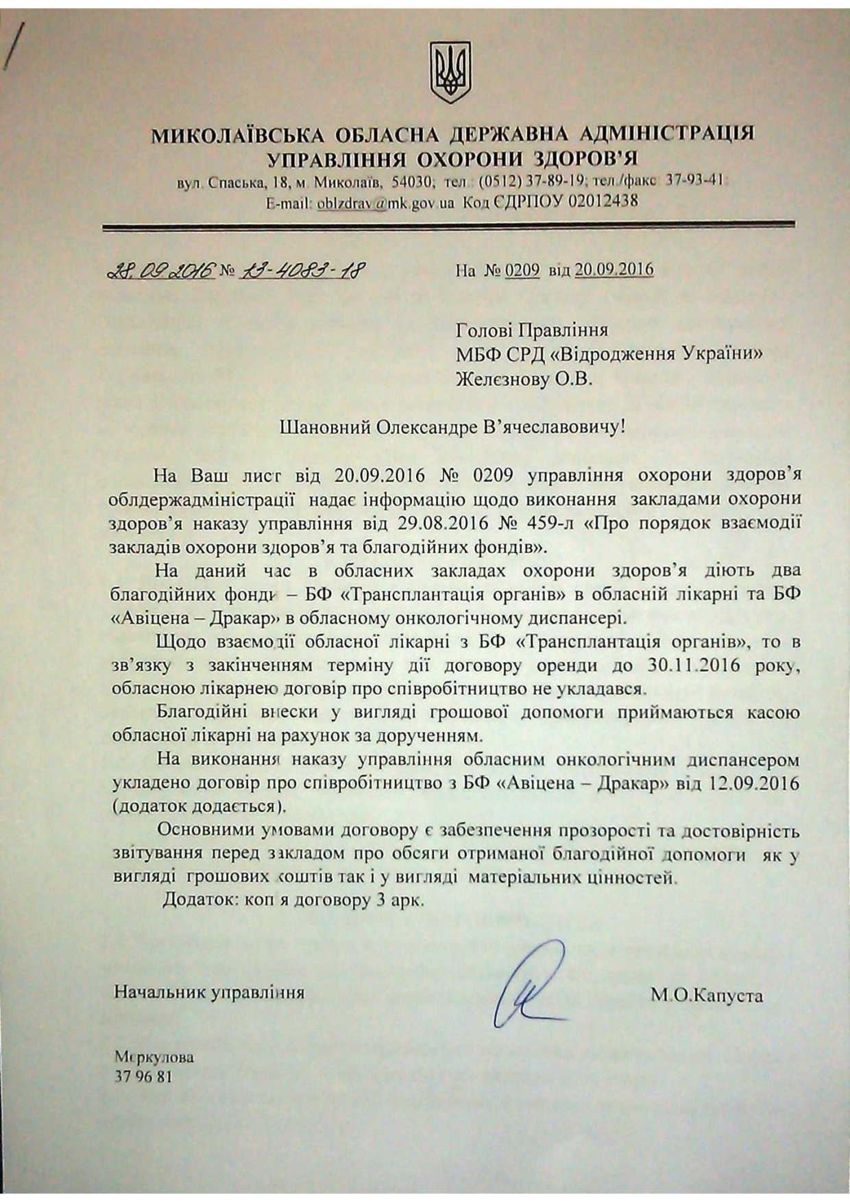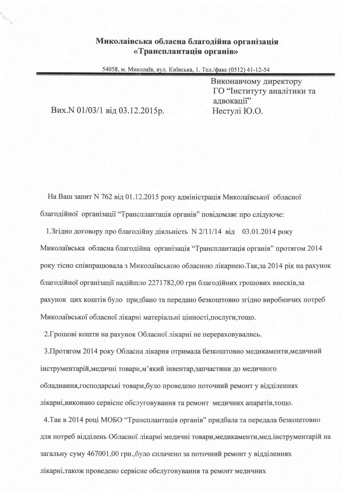 Що ж до інформаційного запиту, то виходячи з нього Миколаївської обласної благодійна організації ‘‘Трансплантація органів” протягом 2014 року тісно співпрацювала з Миколаївською обласною лікарнею. Так, за 2014 рік на рахунок благодійної організації надійшло 2271782,00 грн благодійних грошових внесків,за рахунок цих коштів було придбано та передано безкоштовно згідно виробничих потреб Миколаївської обласної лікарні матеріальні цінності, послуги, тощо.