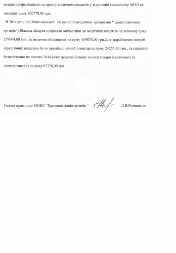 Продовжимо, «так в 2014 році МОБО “Трансплантація органів” придбала та передала безкоштовно для потреб відділень Обласної лікарні медичні товари, медикаменти, мед. інструментарій на загальну суму 467001,00 грн., було сплачено за поточний ремонт у відділеннях лікарні,також проведено сервісне обслуговування та ремонт медичних апаратів,перераховано за оренду медичних апаратів у відділенні гемодіалізу МОЛ на загальну суму 850778,00 грн. В 2014 році від Миколаївської обласної благодійної організації “Трансплантація органів” Обласна лікарня одержала запчастини до медичних апаратів на загальну суму 279994,00 грн.,та медичне обладнання на суму 439874,00 грн. Для виробничих потреб хірургічних відділень було придбано м’який інвентар на суму 24255,00 грн., та передано безкоштовно на протязі 2014 року медичні бланки та госп. товари (сантехніка та електротовари) на суму 63326,00 грн..
