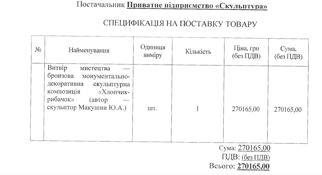 — Если вас интересует вопрос по поводу «Мальчика с бычками», я вам отвечаю, что согласно договору с частным предприятием «Скульптура», это семья Макушиных, скульптура была приобретена за бюджетные деньги, за 270 тысяч гривен. Она была приобретена и установлена на 8 причале, – заявил Юрий Любаров.