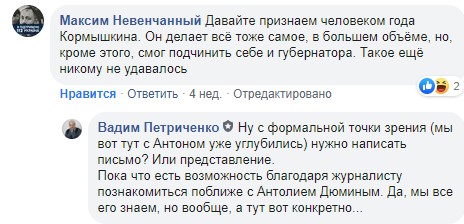 Но вот начали приближаться новогодние праздники, и я получил поздравления от Юрия Кормышкина. Как раньше от Артема Ильюка – с бигборда. А тут еще Максим Невенчанный сообщил, что, по его мнению, именно Юрий достоин звания Человек года в нашем городе.