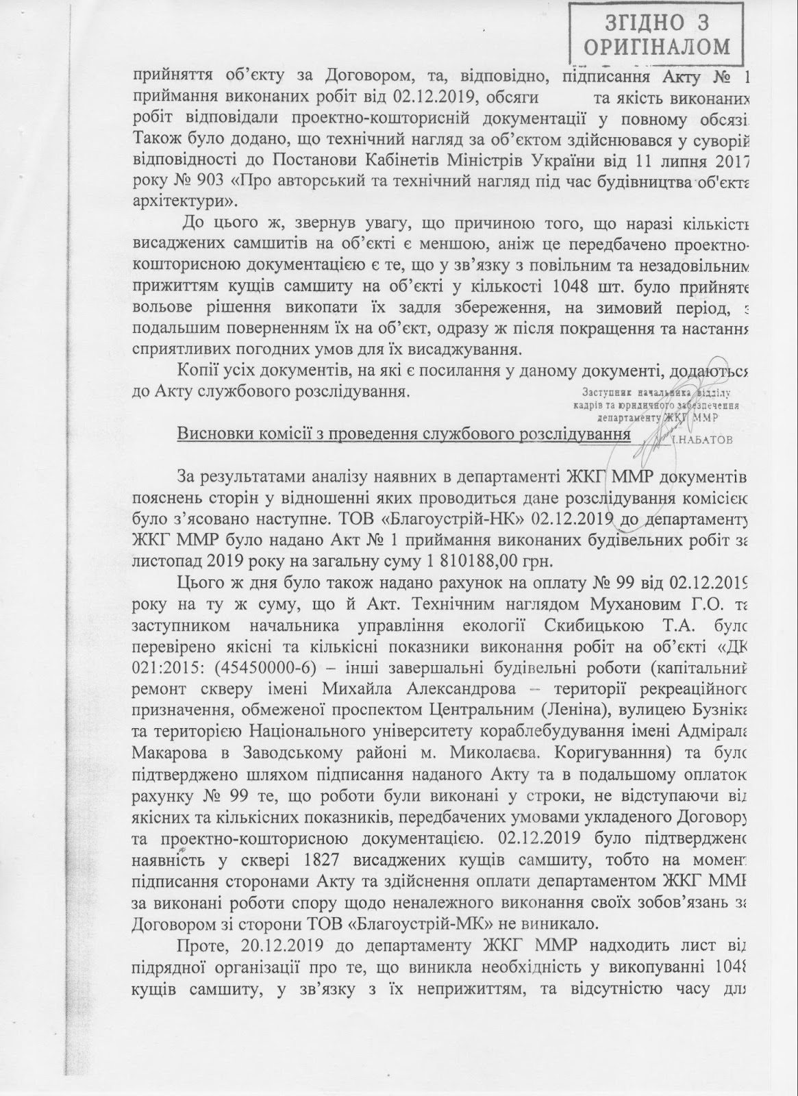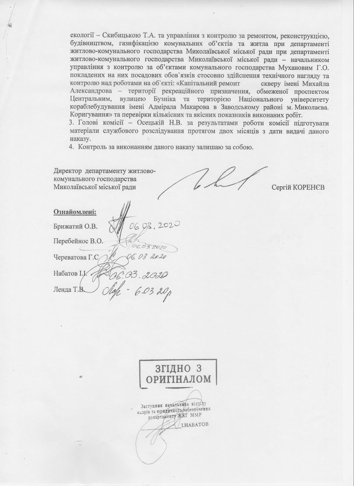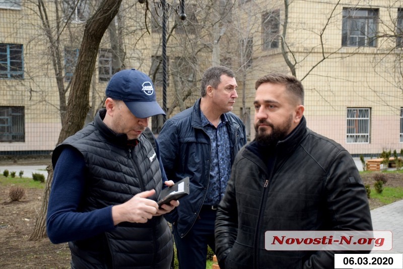 Уже на следующий день в сквере собралась представительная делегация департамента ЖКХ (заказчика работ) во главе с его директором, Сергеем Кореневым. Обследование проходило под пристальным контролем Андрея Ермолаева, директора департамента по противодействию коррупции, в присутствии технадзора Муханова и не представившегося представителя подрядчика, компании ТОВ «Благоустрій-НК».