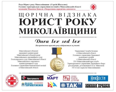 10 грудня, в пятницю о 17.00год в сесійному залі Миколаївської обласної ради (вул. Адміральська, 22) відбудеться урочисте вручення відзнаки «Юрист року Миколаївщини».
