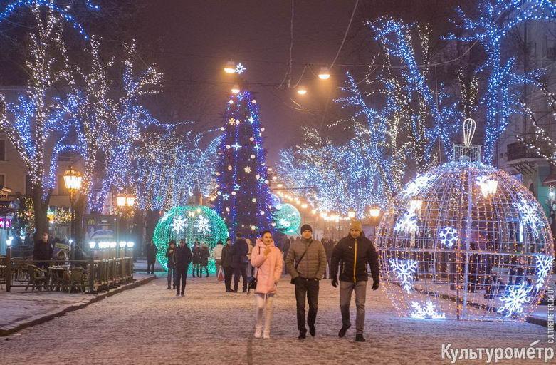 В соседней Одессе городские власти не пожалели денег и фантазии и выделили из бюджета 1,5 миллиона гривен для того, чтобы украсить к Новому году центральную улицу города – Дерибасовскую. Улица превратилась в яркую и праздничную фотозону. Кроме традиционной елки, почти все деревья на Дерибасовской теперь светятся новогодними гирляндами, а на брусчатой мостовой установили огромные 5-метровые светящиеся елочные шары.