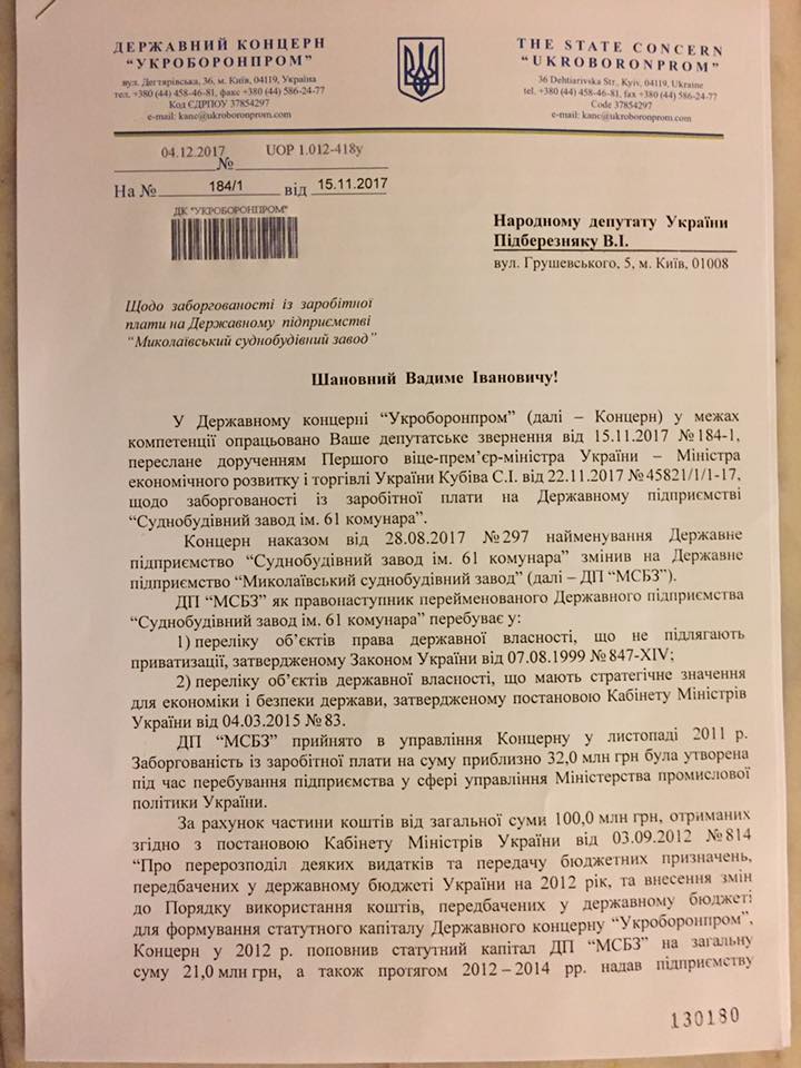 Такой ответ получил народный депутат Украины от партии «Народный фронт» Вадим Пидберезняк от главы государственного концерна «Укроборонпром» Романа Романова.