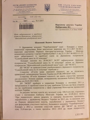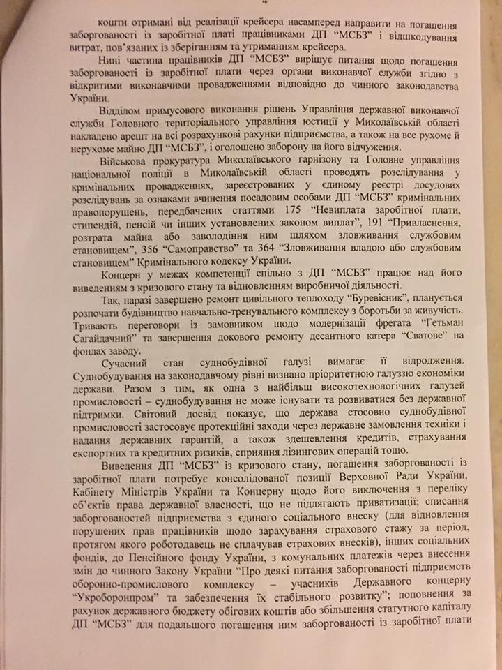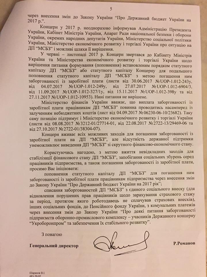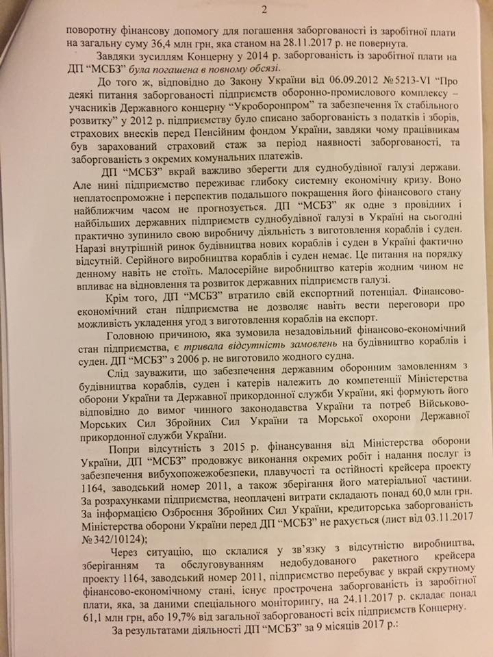 Роман Романов просит содействовать внесению изменений в государственный бюджет 2017 года и предусмотреть пополнение уставного фонда предприятия для дальнейшего погашения долгов по зарплате. Кроме того «Укроборонпром» предлагает списать «Николаевскому судостроительному заводу» долги по единому социальному взносу и другим взносам в Пенсионный Фонд Украины.