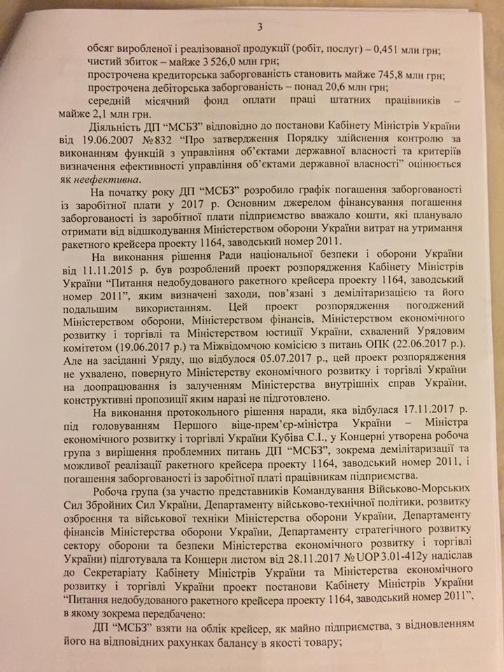 — Нам, фактически, сказали, что концерн ничего погашать не будет, завод на данный момент неподъемный, погасить задолженность можно либо путем продажи крейсера, либо, уважаемые народные депутаты, пополните нам уставной фонд, чтобы мы могли погасить эту задолженность. В этой связи повторно обращаюсь к премьер-министру с тем, что такой подход к вопросу никого не устраивает и мы, вместе с другими народными депутатами, требуем конструктивного подхода для скорейшего решения этой проблемы, - отметил Вадим Пидберезняк.