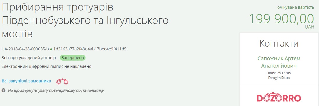 Так, Департамент ЖКХ 28 апреля заключил договор по уборке тротуаров Южно-бугского и Ингульского мостов с фирмой ООО «Грандпол» на 199 тысяч 900 гривен.