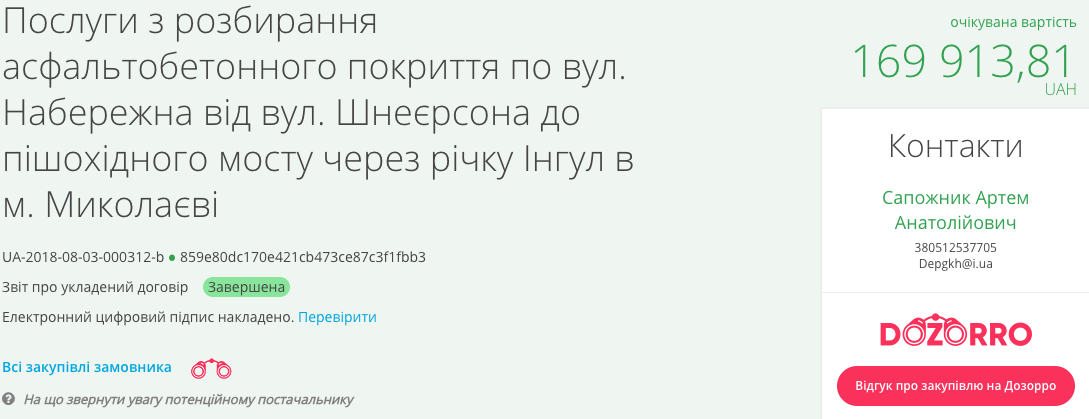 Согласно данным ресурса, чиновники Департамента 3 августа заключили договор с предпринимателем Сергеем Озейчуком на 169 тысяч 913 гривен по демонтажу старого асфальтового покрытия у судостроительной верфи.