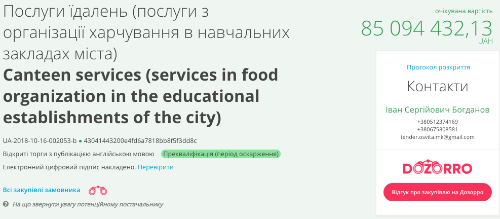 Согласно данным ресурса, чиновники управления образования объявили торги на услуги по организации питания в учебных заведениях города с ожидаемой стоимостью работ в 85 миллионов 94 тысячи 432 гривны.