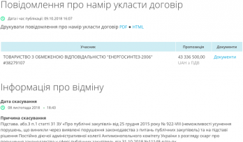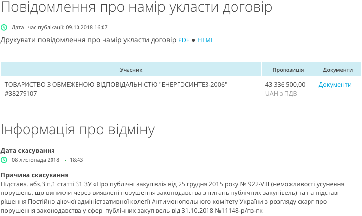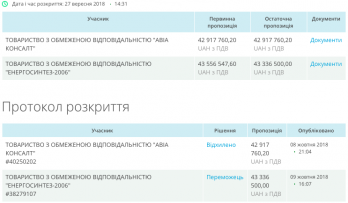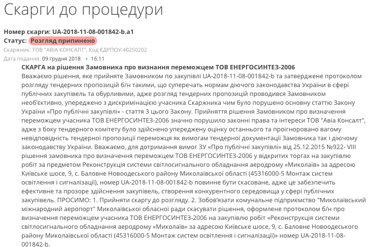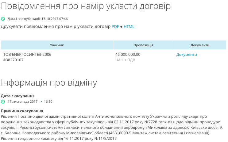 Согласно данным ресурса, первый тендер по реконструкции системы светосигнального оборудования аэродрома был объявлен еще 15 августа 2017 года с ожидаемой стоимостью в 46 миллионов 365 тысяч 308 гривен. Тогда участниками открытого аукциона стали всего две фирмы: ООО «Энергосинтез-2006» с предложением в 46 миллионов гривен и ООО «СДЛ монтаж» с более выгодным предложением в 41 миллион 260 тысяч гривен. Чиновники в свою очередь приняли решение отдать предпочтение более дорогому предложению «Энергосинтез-2006». Однако Антимонопольный комитет Украины, рассмотрев жалобу их конкурента, принял решение отменить данный тендер, так как выявил ряд нарушений, допущенных в ходе его проведения.