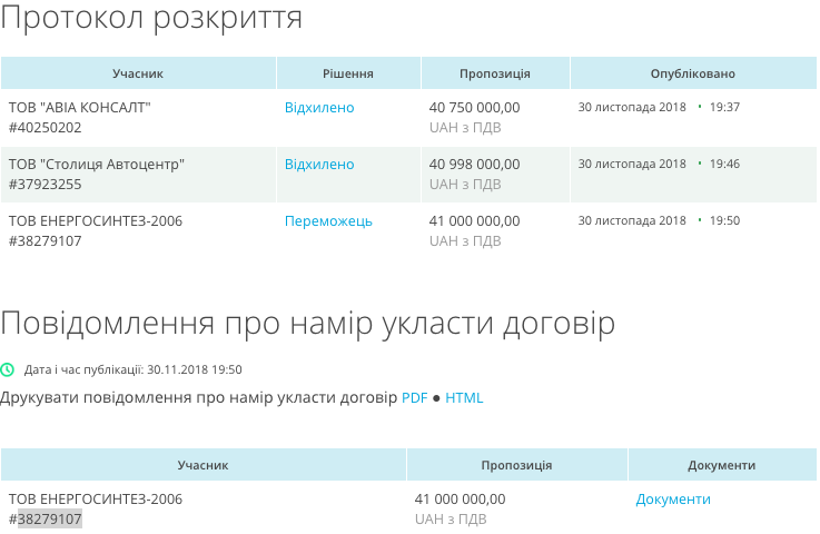 В третий раз чиновники попытались провести торги в ноябре 2018 года, установив ожидаемую стоимость работ 43 миллиона 641 тысячу 921 гривну. В этот раз участие в тендере приняло три фирмы, среди которых: ООО «Авиа Консалт» с предложением в 40 миллионов 750 тысяч, ООО «Энергосинтез-2006» с предложением в 41 миллион гривен и ООО «Столица Автоцентр», запросившее 40 миллионов 998 тысяч гривен.