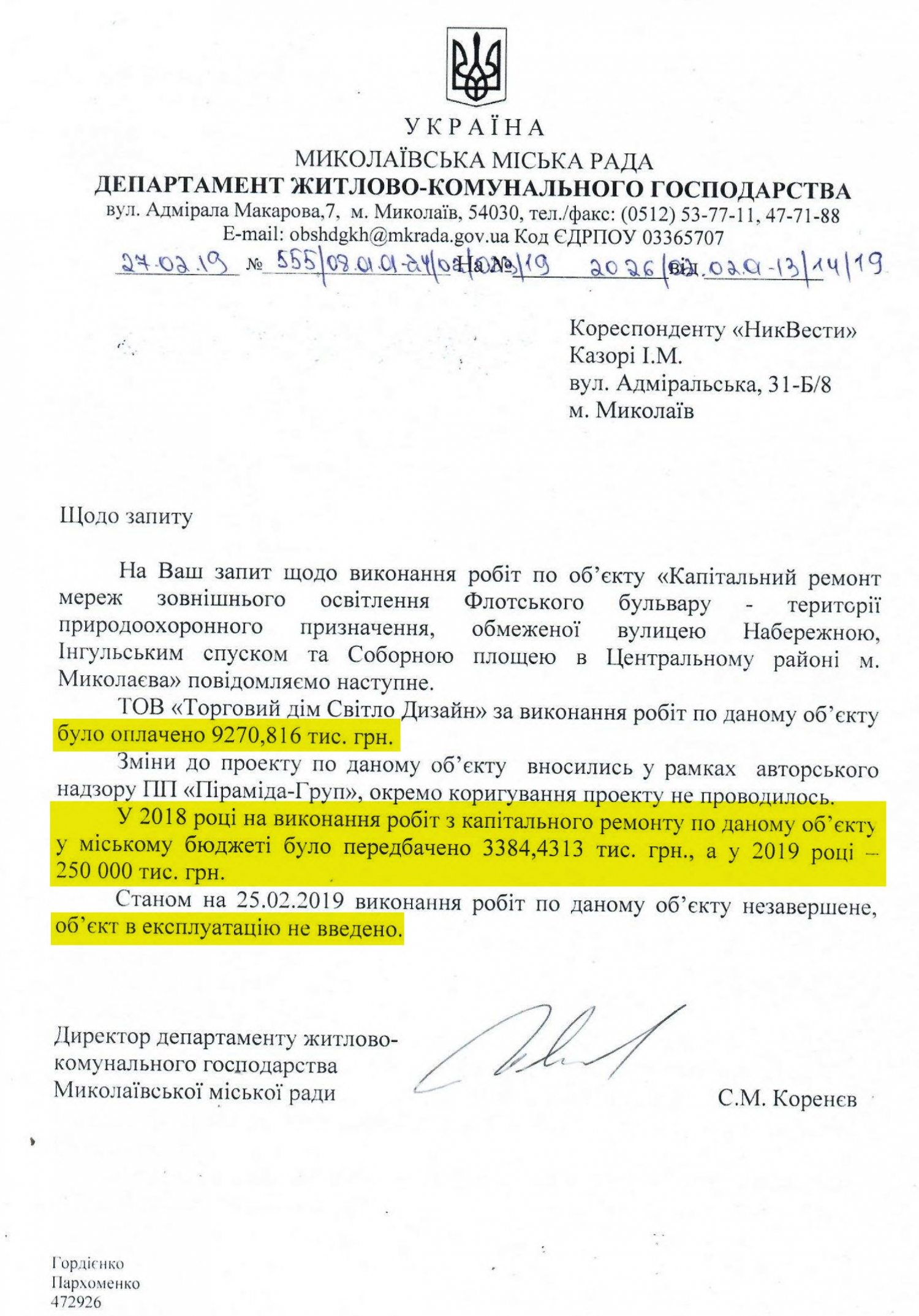 Об этом говорится в ответе директора Департамента ЖКХ Николаевского городского совета Сергея Коренева на информационный запрос НикВестей.
