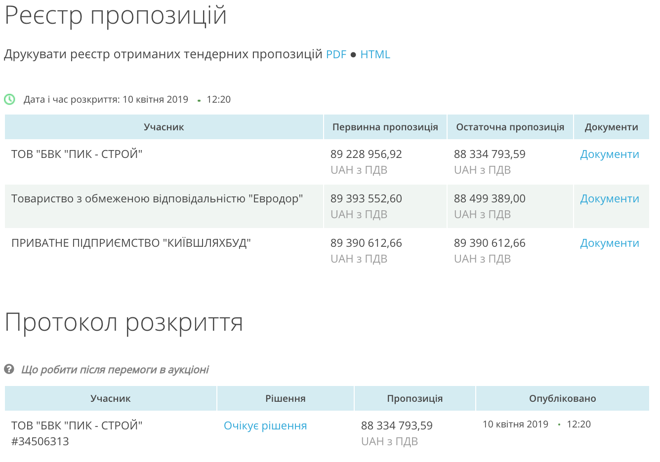 Аукцион по данным торгам прошел сегодня, 10 апреля. Так, его участниками стали две компании из Одессы «БВК Пик-Строй» с предложением в 88 миллионов 334 тысячи 793 гривны и «Евродор» с предложением в 88 миллионов 499 тысяч 389 гривен и киевское частное предприятие «Киевпутьстрой», которое согласилось выполнять работы за 89 миллионов 390 тысяч 612 гривен.