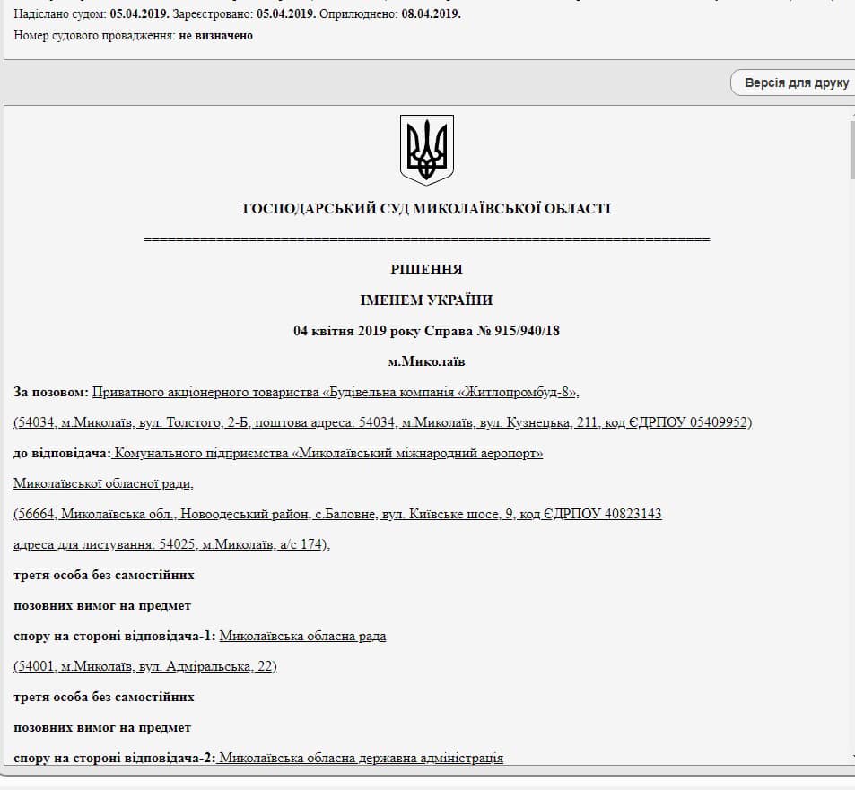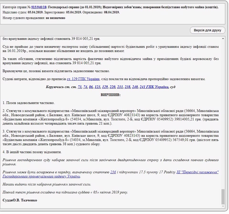 Хозяйственный суд Николаевской области принял решение взыскать с коммунального предприятия «Николаевский международный аэропорт» в пользу строительной компании «Жилпромстрой-8» 39,8 миллиона гривен за проделанные работы по реконструкции здания аэровокзала.