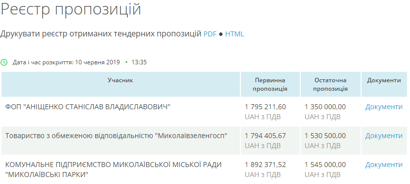 Участие в торгах приняло три предприятия, среди которых: ООО «Николаевзеленхоз» с предложением 1 миллион 530 тысяч 500 гривен, КП Николаевского городского совета «Николаевские парки» с предложением 1 миллион 545 тысяч и фирма Станислава Анищенко.