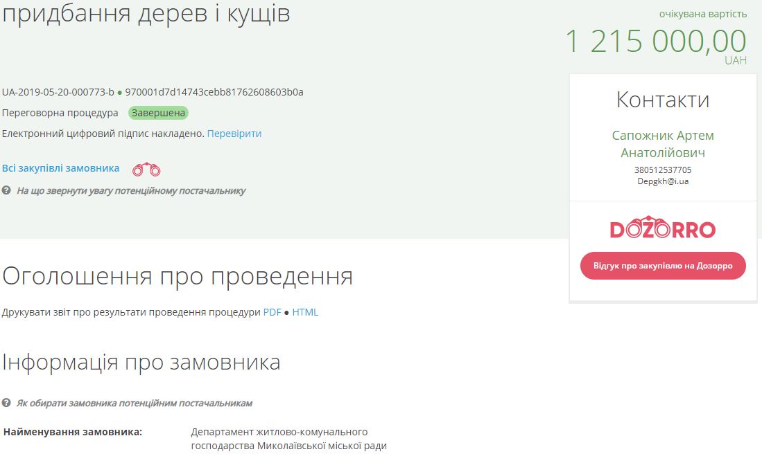 Департамент 3 июля заключил договор на покупку рассадницкой продукции, а именно 3 тысяч 583 экземпляров деревьев и кустов за 1 миллион 211 тысяч 685 гривен с предпринимателем Максимом Губа. Товар должен быть поставлен до 10 октября 2019 года.