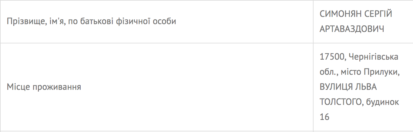 Примечательно, что согласно данным сайта Министерства юстиции Украины, Сергей Симонян был зарегистрирован в феврале 2018 года, в Черниговской области, в городе Прилуки, на улице Льва Толстого, 16. Предприниматель занимается специализированными строительными работами, не включенными в другие категории, арендой и лизингом строительной техники и оборудования для строительства гражданских объектов, оптовой торговлей лесоматериалами, строительными материалами и сантехническим оборудованием, неспециализированной оптовой торговлей, грузовыми перевозками автомобильным транспортом, арендой и лизингом грузовых транспортных средств.