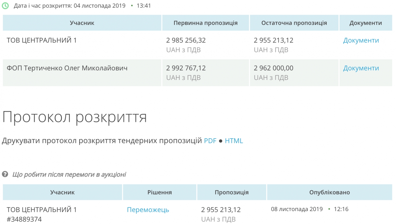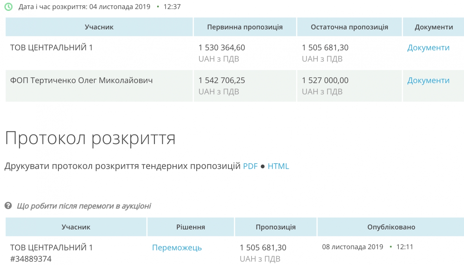 Участниками торгов стало ООО «Центральный 1», которое согласилось выполнять работы за 1 миллион 505 тысяч 681 гривну, и предприниматель Олег Теритичено, который запросил сумму в 1 миллион 527 тысяч гривен. В итоге чиновники решили отдать предпочтение более выгодному предложению ООО «Центральный 1» и предложили компании заключить договор.