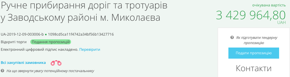 Согласно данным ресурса, 9 декабря 2019 года чиновники объявили тендер на ручную уборку дорог и тротуаров в Заводском районе с ожидаемой стоимостью в 3 миллиона 429 тысяч 964 гривны.