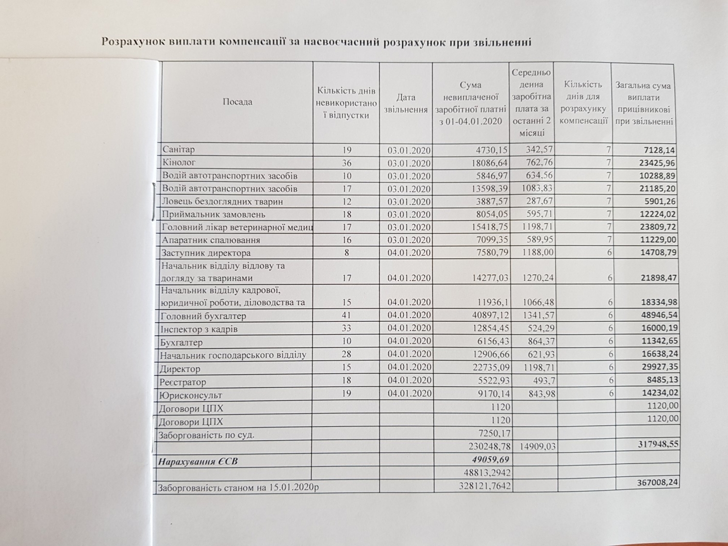 К заявлению также прикрепили ведомость по расчетам компенсации задолженности. В документе указывается, что средняя дневная зарплата экс-директора Александра Голобродского за последние несколько месяцев составляла 1198 гривен, главного бухгалтера – 1341 гривну, начальника отдела отлова и ухода за животными – 1270 гривен.