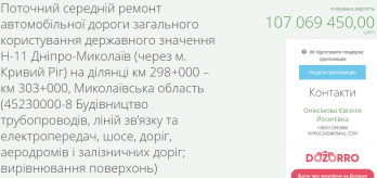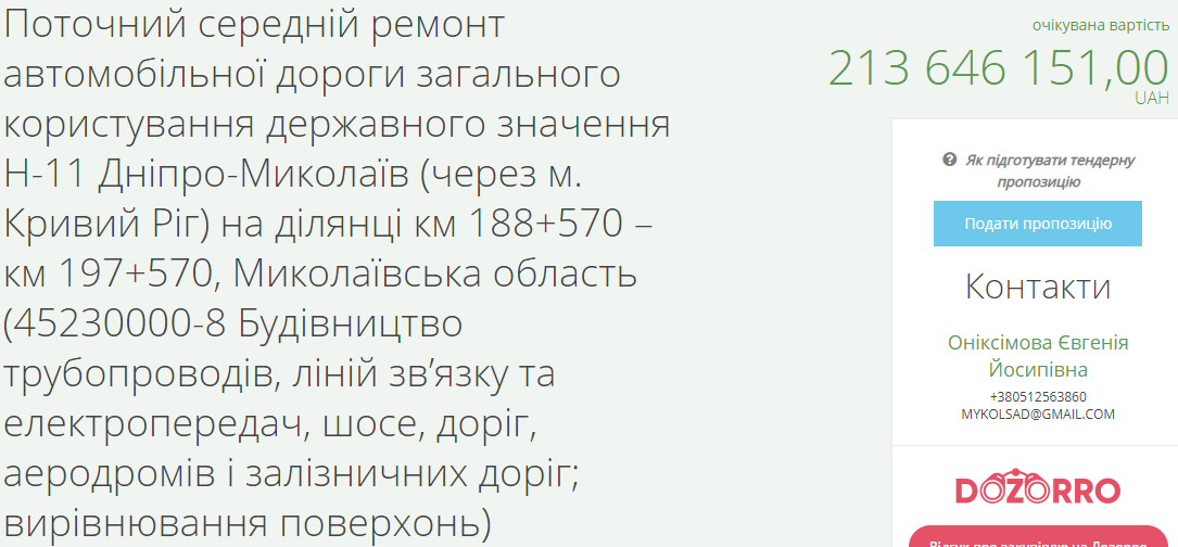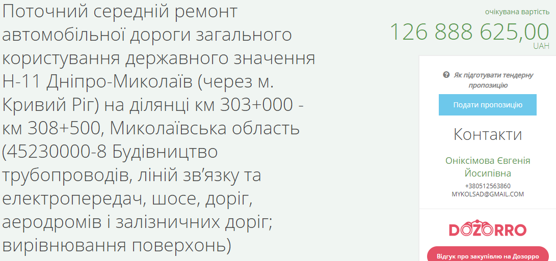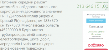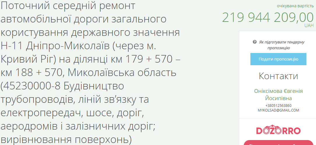 САД Николаевщины 19 мая объявил торги на текущий средний ремонт автомобильной дороги общего пользования госзначения Н-11 Днепр — Николаев через Кривой Рог на участках трассы км 298+000 – км 303+000 (5 километров) с ожидаемой стоимостью 107 миллионов 69 тысяч 450 гривен, км 303+000 - км 308+500 (5 километров) за 126 миллиона 888 тысяч 625, на участке км 188+570 – км 197+570 (9 километров) за 213, 6 миллионов и км 179 + 570 – км 188 + 57 (9 километров) за 219, 9 миллиона гривен.