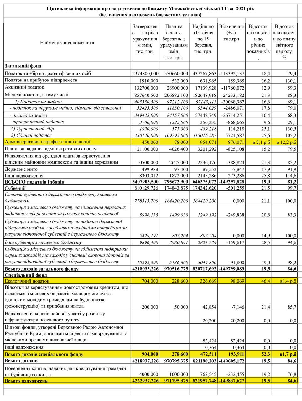 Всего по состоянию на 15 марта поступления в бюджет Николаева выполнены на 84,6%, что составляет 821 миллион 957 тысяч гривен, из которых доходы специального фонда бюджета - 472 тысячи гривен.