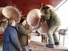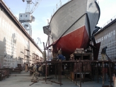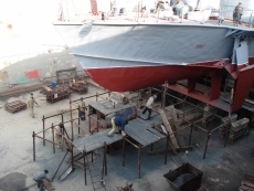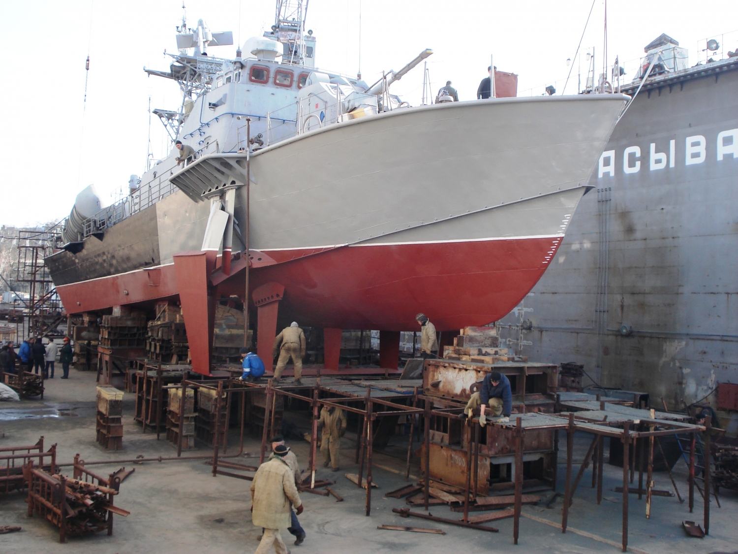 На данный момент все доковые ремонтные работы на ракетном катере практически завершены, проходят последние проверки всех систем перед спуском, наносится бортовой номер и название катера, демонтируются строительные леса вокруг корабля.