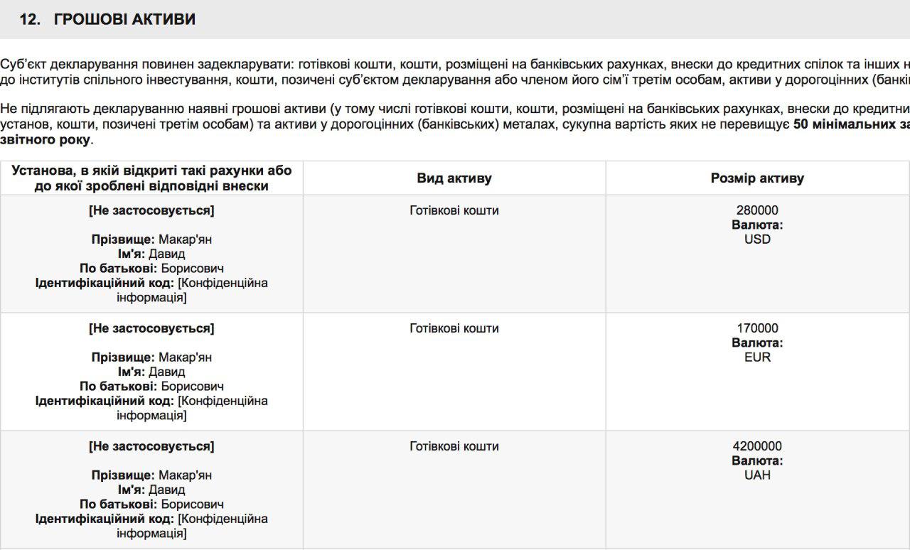 В разделе денежные активы Давид Макарьян сначала задекларировал 280 тысяч долларов США, 170 тысяч евро и 4 миллиона 200 тысяч гривен наличными. Впоследствие народный депутат подал еще одну декларацию, которая отличается от предыдущей тем, что сумма наличных средств в долларах выросла до 850 тысяч, в евро до 350 тысяч.