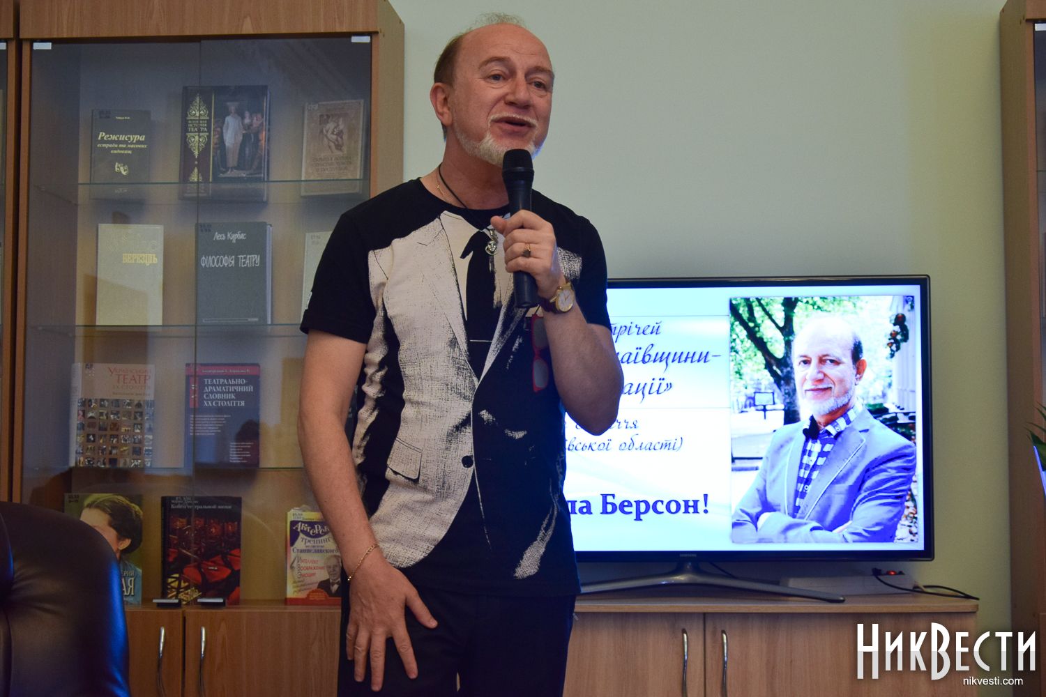 8 июня Николаевская областная библиотека имени Алексея Гмырева открыла цикл встреч «Элита Николаевщины – гордость нации», посвященный 80-летию Николаевской области. Первым приглашенным гостем цикла стал директор Николаевского академического украинского театра драмы и музыкальной комедии Николай Берсон.