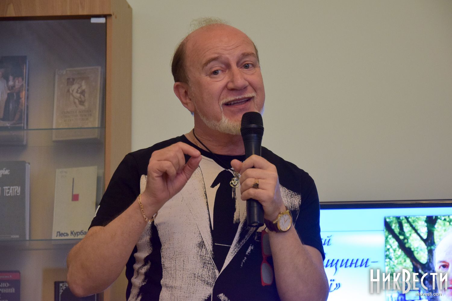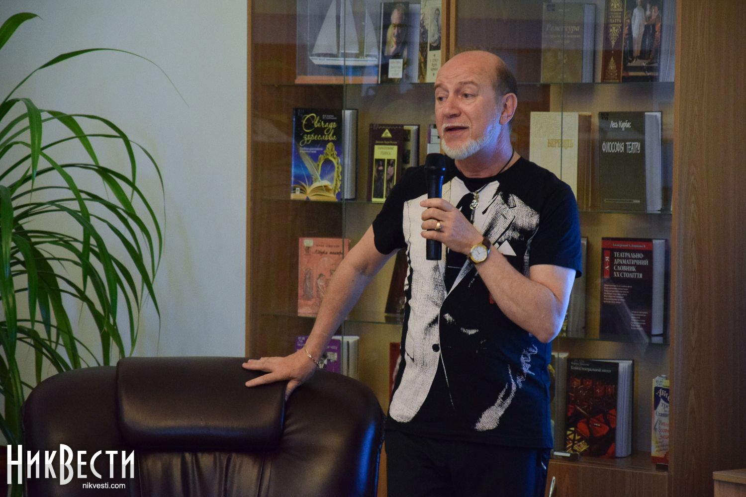Среди прочего руководитель театра рассказал занимательные истории о том, как он на спор выиграл помещение под малую сцену у бывшего мэра Николаева Владимира Чайки, и как его заведение выиграло конкуренцию у Донецка за звание первого академического театра в стране, передают НикВести.