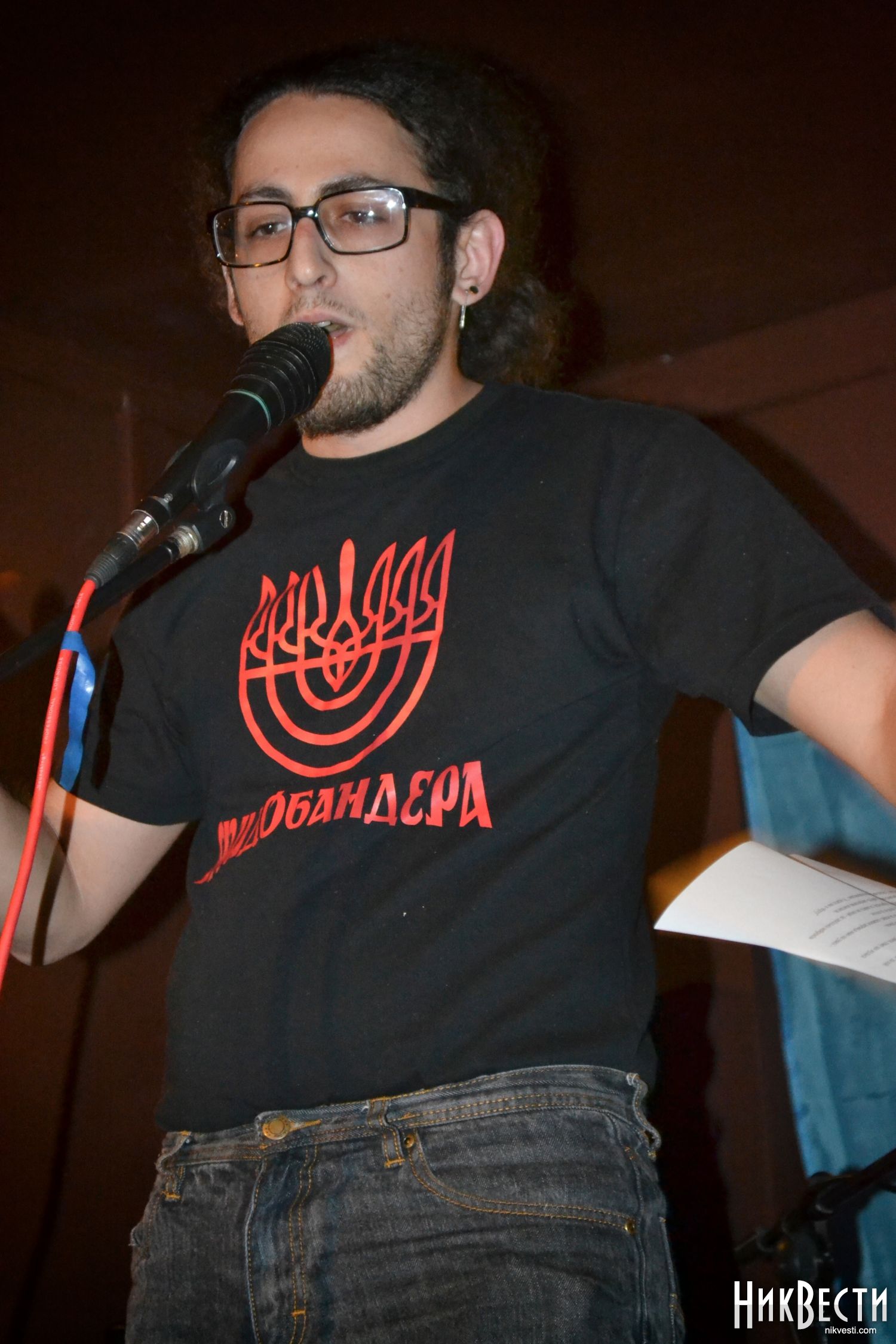 Получивший на недавнем конкурсе документального короткометражного кино «Гражданский проектор» приз зрительских симпатий за работу «Памятка оккупанту Николаева» Евгений Уманов лаконично выразил свои взгляды, сняв толстовку, под которой оказалась футболка с надписью «Жидобандера».