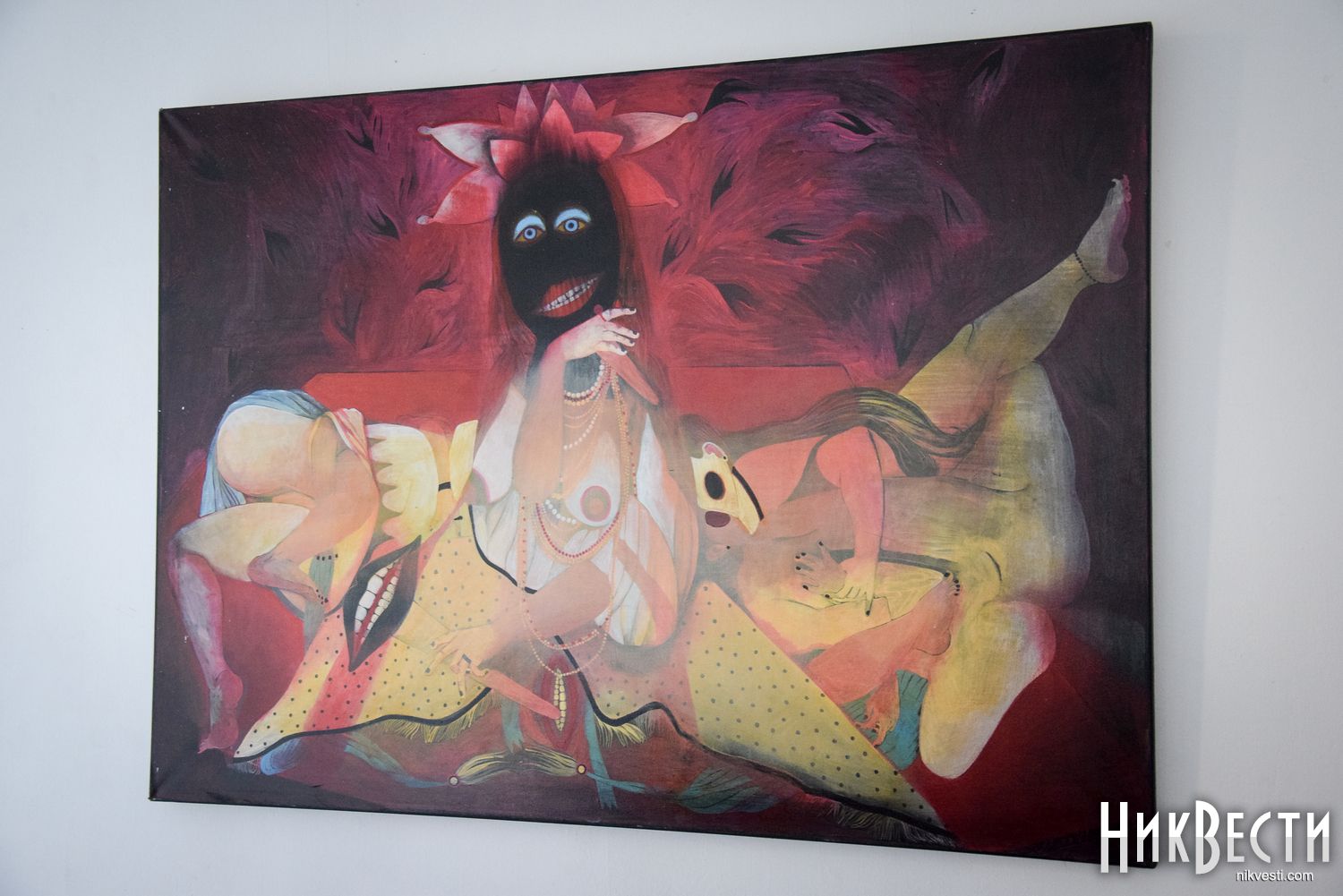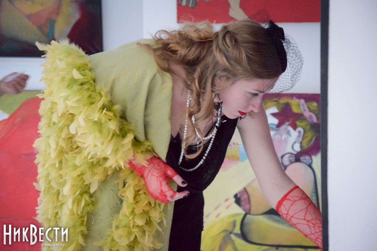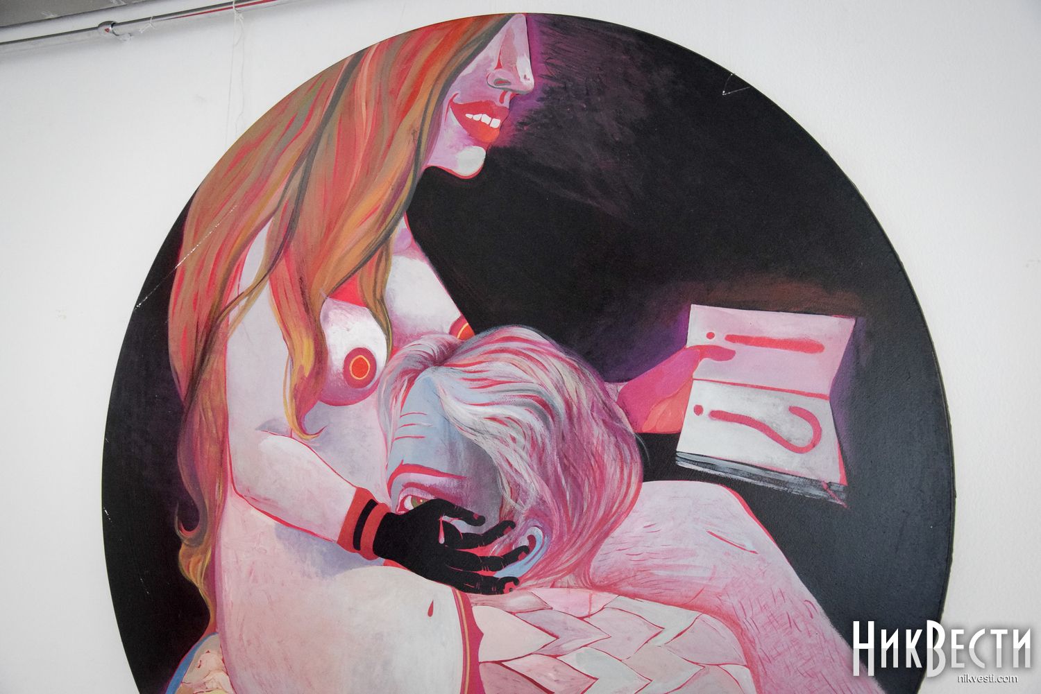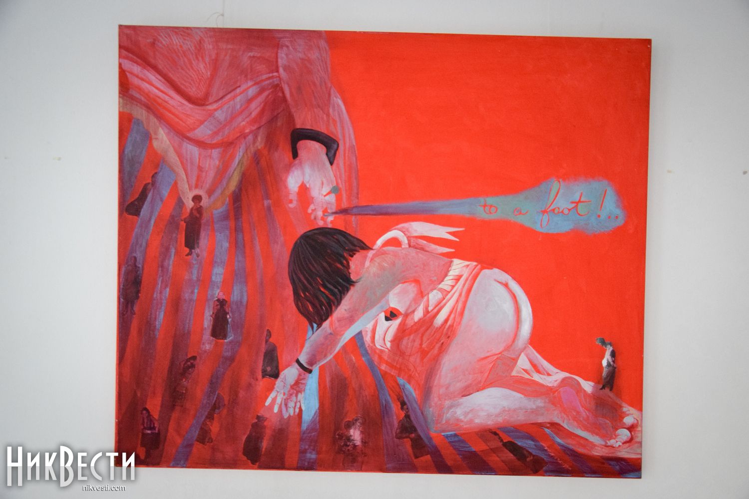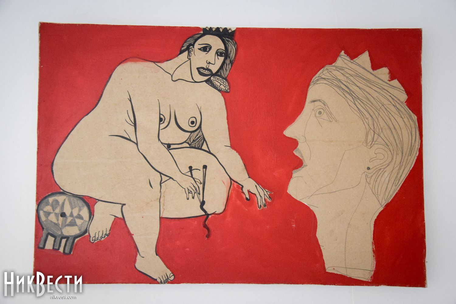 – Я очень хотел, чтобы Нина сделала выставку в Николаеве. Это большая редкость, когда женщина раскрывает свою душу, или даже «вскрывает себе вены», как будто говоря: «Вот она я, смотрите!» И это все с привкусом балаганного искусства, напоминающего рекламу цирка начала прошлого века. Постмодернизм – это искусство цитатное. А ее работы – это и есть цитаты. Когда мы делали экспозицию, мы так и хотели – создать атмосферу цирка. Человек в нем вскрывает вены, а кровь течет настоящая. Вот такой у нас цирк, – описал экспозицию Дмитрий Молдованов.