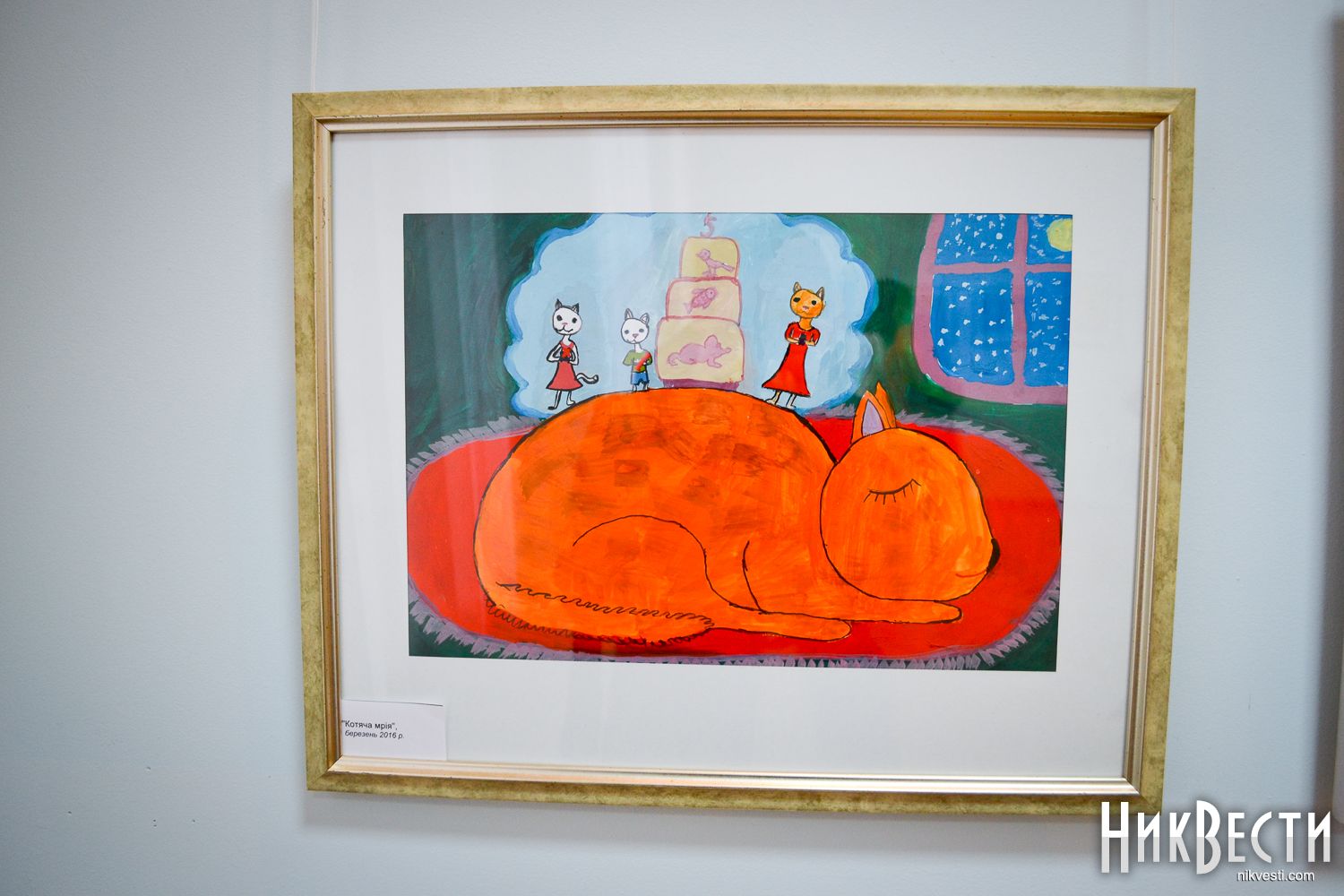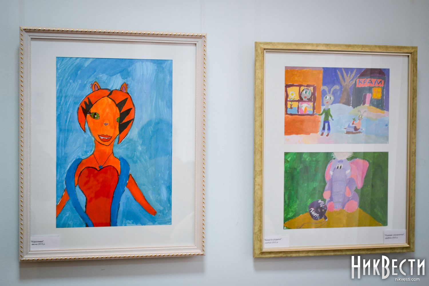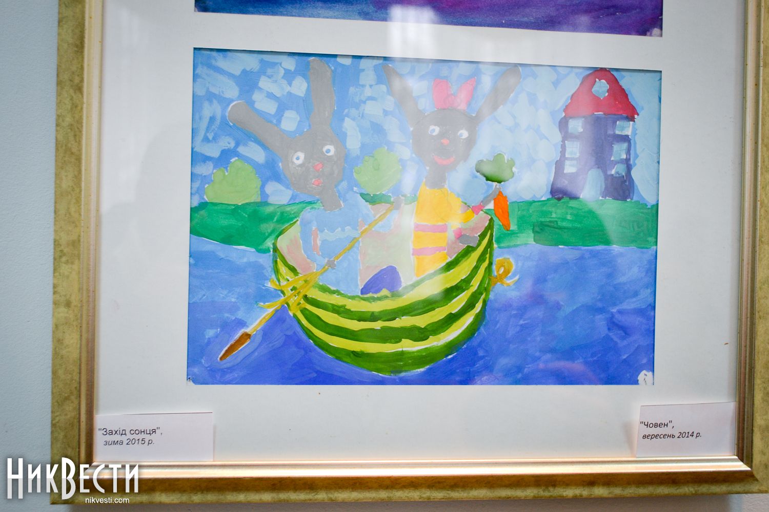 Среди работ Саши сказочные существа, герои мультфильмов, животные, рисунки с натуры и натюрморты. Выставку организовал методист кафедры теории и методики языково-литературного и художественно эстетического образования Николаевского областного института последипломного образования Дмитрий Крик.