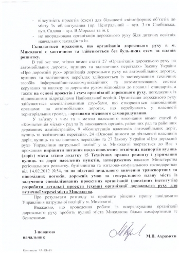 Для исправления ситуации работники сектора безопасности дорожного движения УПП в Николаеве в очередной раз обратились к городским властям с просьбой решить вопрос по обновлению технических паспортов улиц (дорог) города согласно приложению 15 «Технических правил ремонта и содержания улиц и дорог населенных пунктов, утвержденных приказом Министерства регионального развития, строительства и жилищно-коммунального хозяйства» от 14.02.2012 №54, и на основании детального изучения транспортных и пешеходных потоков, дорожных условий и генерального плана города с привлечением специализированных проектных организаций (исследовательских институтов) разработать детальные проекты (схемы) организации дорожного движения для уличной сети города Николаева.