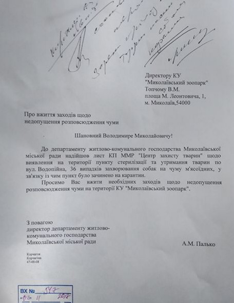 Директор департамента ЖКХ Николаевского горсовета Андрей Палько в официальном письме директору Николаевского зоопарка Владимиру Топчему сообщил о выявлении чумы мясоедных на территории КП «Центр защиты животных».