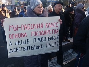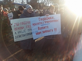 Всего участие в акции принимает около 50 человек. Они держат в руках плакаты. Требование - выплата долгов по заработной плате.