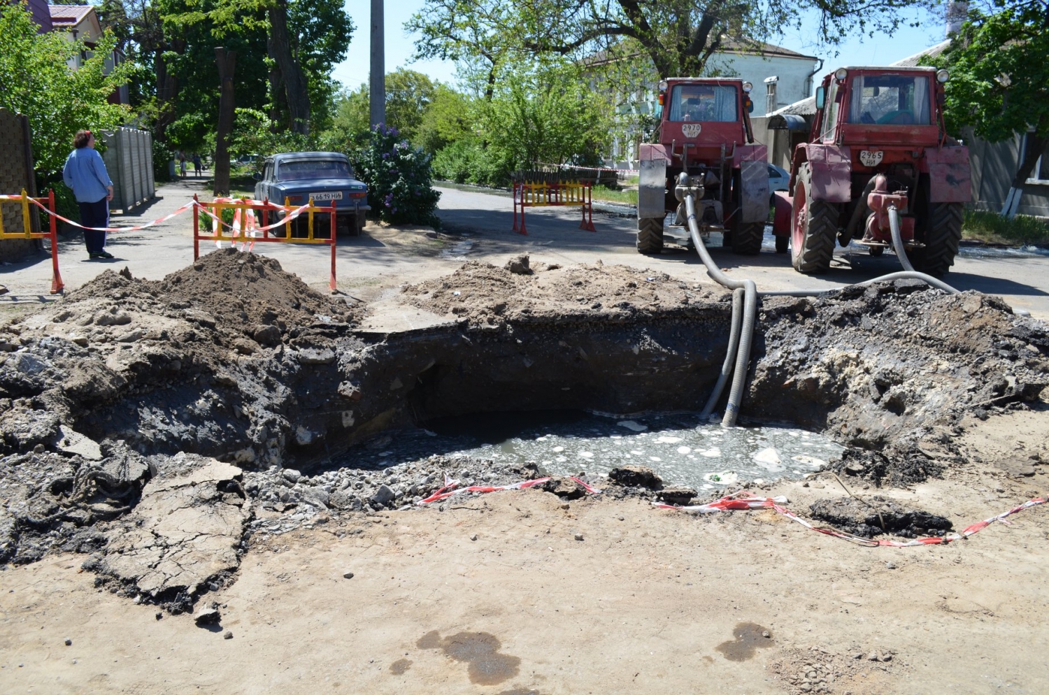 На месте провала вчера работали 7 единиц техники и аварийно-ремонтная бригада. Сегодня работает 12 единиц техники и 2 бригады. Также 2 дня подряд на месте аварии работают технический директор Василий Тельпис, руководитель службы водоотведения Александр Зубов, начальник канализационной сети Алексей Кулаков.