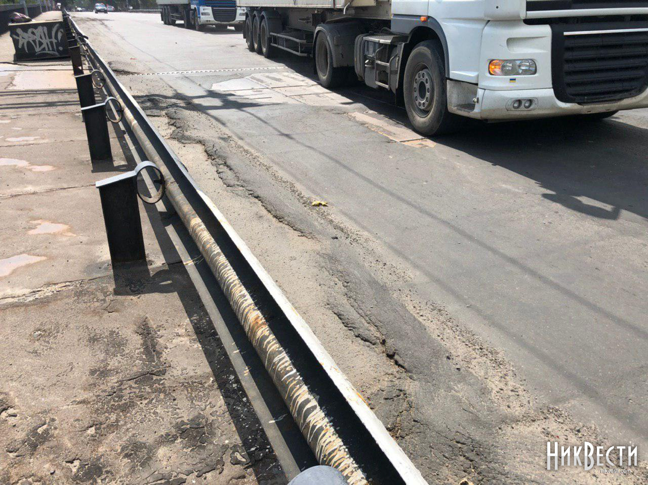 В Николаеве из-за большегрузов стало разрушаться дорожное покрытие Ингульского моста, местами асфальт отсутствует вовсе.