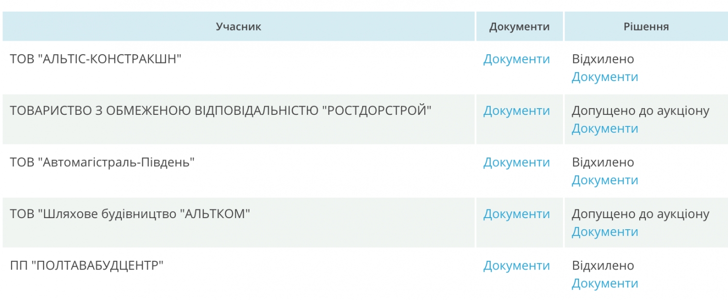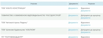 Для участия в торгах зарегистрировалось пять фирм, среди которых «Полтавабудцентр», «Росдорстрой», «Автомагистраль-юг», «Альтис-констракшен» и «Альтком».