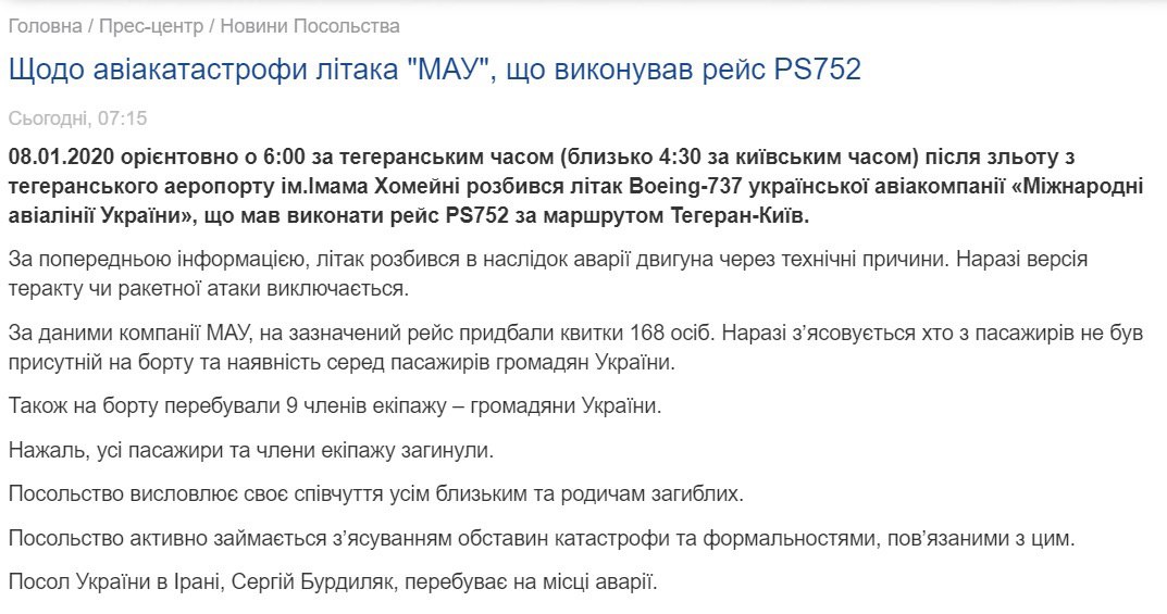 — По предварительной информации представителя авиакомпании Международные авиалинии Украины, 8 января 2020 года после взлета из международного аэропорта Имам Хомейни (г. Тегеран) пассажирский самолет авиакомпании МАУ потерпел катастрофу и упал недалеко от аэропорта. По информации, которая уточняется, пассажиры указанного рейса и экипаж погибли. Уточненная информация по погибшим гражданам Украины будет отправлена дополнительно, - сказал заместитель директора Департамента — начальник Управления консульского обеспечения Василий Кирилыч в комментарии «Интерфакс-Украина».