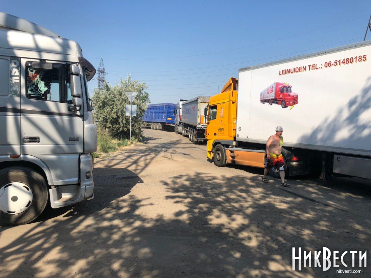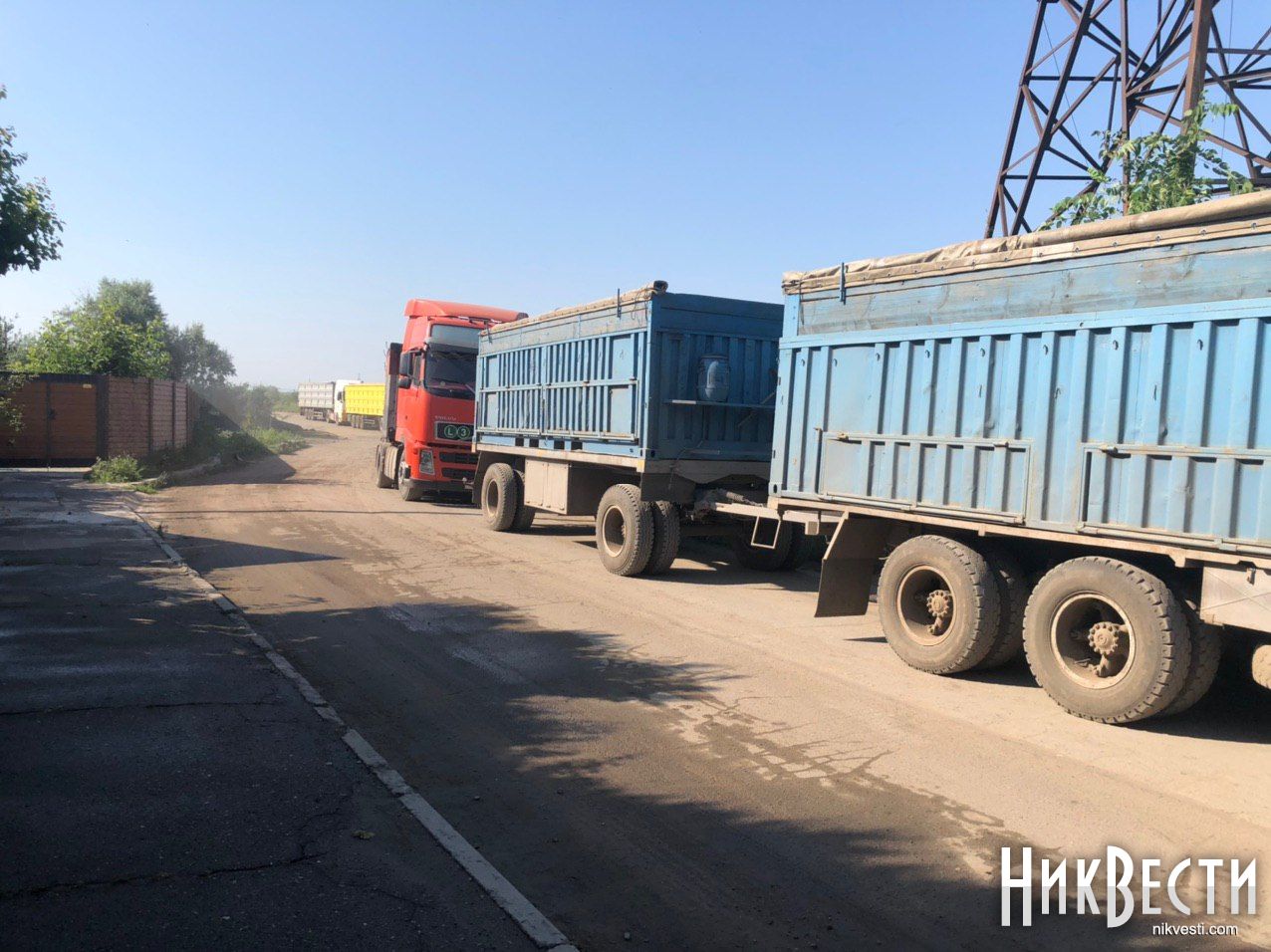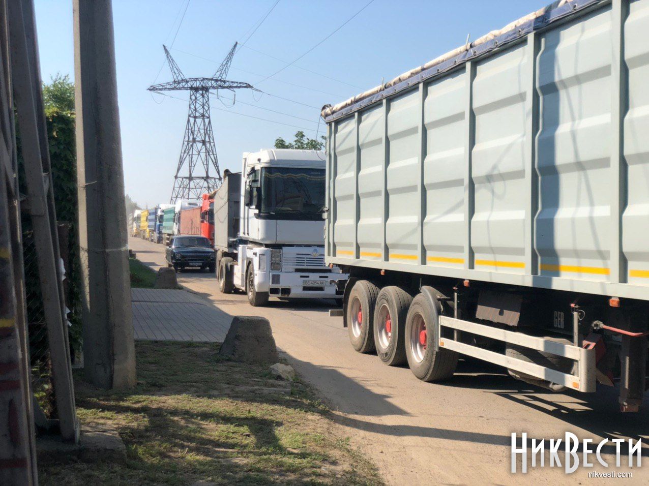 Сотни грузовиков скапливаются в очереди на обочинах дорог на въездах в город и на улицах Железнодорожной, Космонавтов, Новозаводской и Турбинной в самом Николаеве.