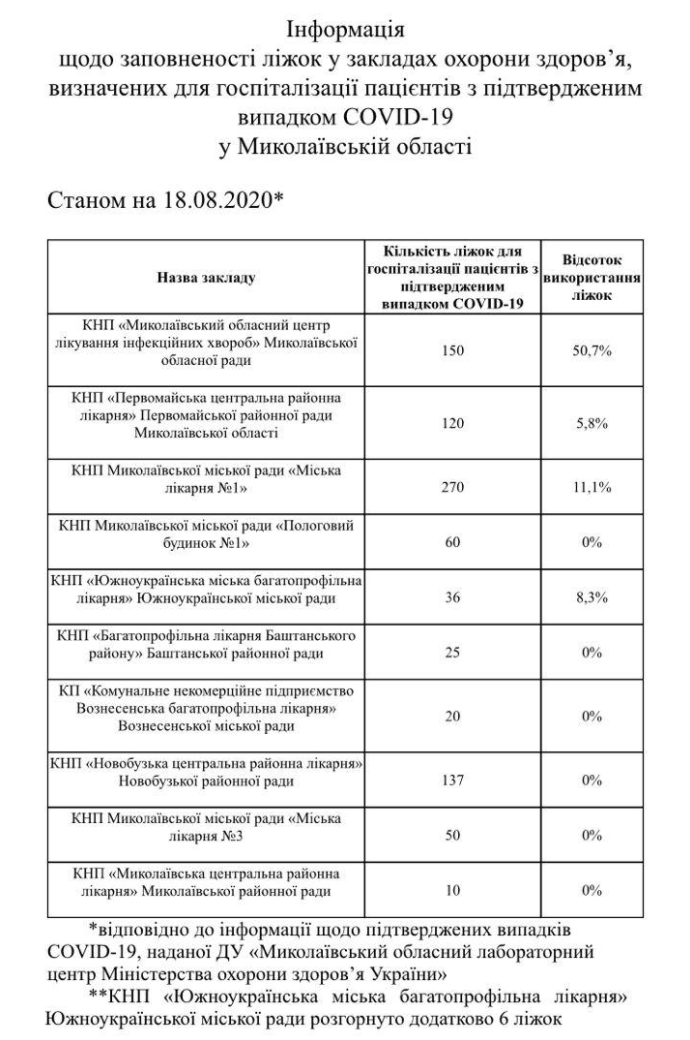 По состоянию на 18 августа количество койко-мест «Николаевского областного центра лечения инфекционных болезней» занято на 50,7%.
