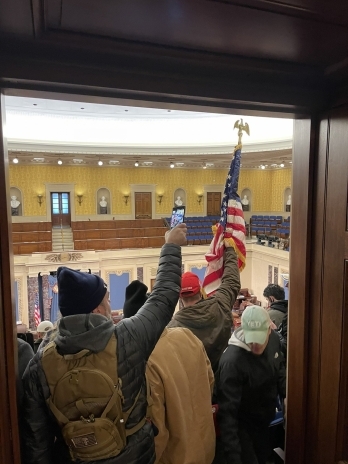 Как сообщают источники CNN, полиция Капитолия запросила помощь со стороны других правоохранительных структур в связи со сложившейся ситуацией. Несколько протестующих бьют окна и ломают двери.