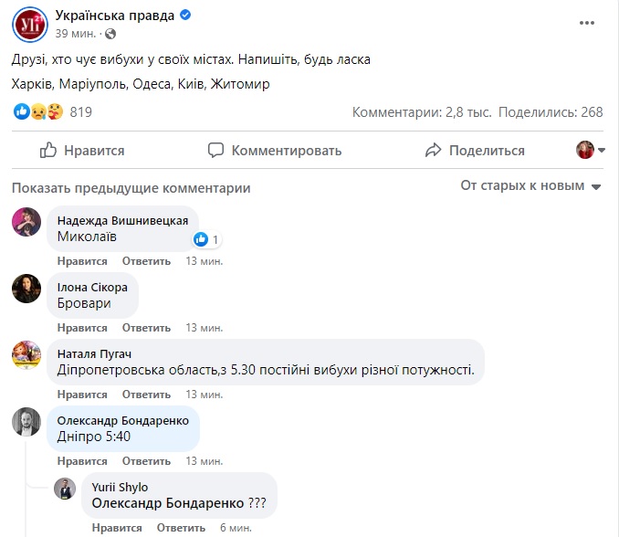 В разных городах Украины слышны взрывы. Их уже слышали в Киеве, Бердянске, Одессе, Житомере и Харькове.