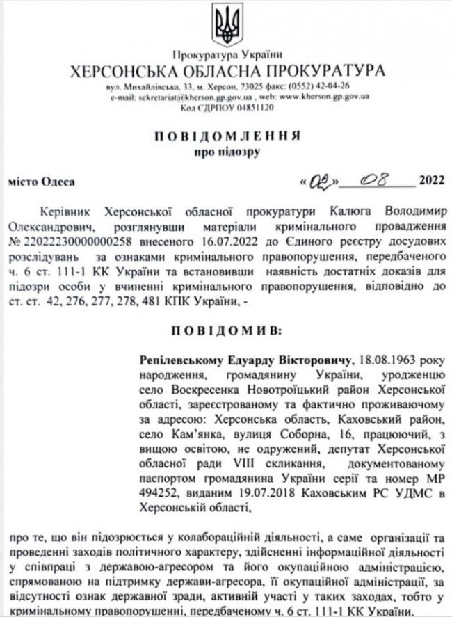Депутату Херсонської облради Репілевському повідомили про підозру в колабораціонізмі