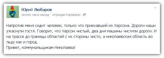 — А Николаевская область во льду, как и город! Привет коммунальщикам Николаева! – написал Юрий Любаров.