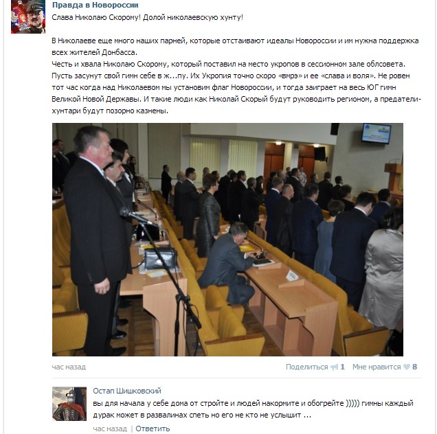 Сторонники боевиков Донбасса уверены, что депутат Николаевского областного совета Николай Скорый, который позволил себе сидеть во время звучания государственного гимна Украины, станет руководителем области после победы российско-террористической организации «Новороссия».