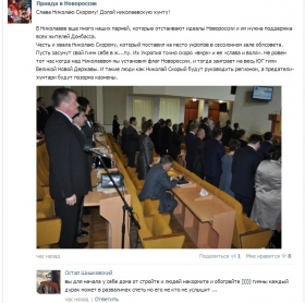 — В Николаеве еще много наших парней, которые отстаивают идеалы Новороссии, и им нужна поддержка всех жителей Донбасса. Честь и хвала Николаю Скорому, который поставил на место укропов в сессионном зале облсовета. Не ровен тот час когда над Николаевом мы установим флаг Новороссии, и тогда заиграет на весь ЮГ гимн Великой Новой Державы. И такие люди как Николай Скорый будут руководить регионом, - сказано в сообщении.