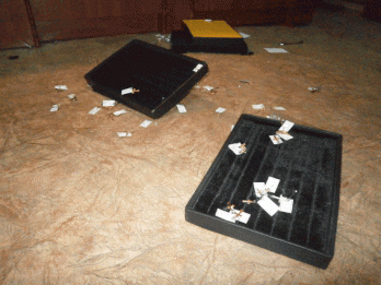 Как рассказал реализатор, она успела нажать кнопку тревожного вызова службы охраны, и они приехали почти мгновенно. Но преступники, вероятно предвидя такое развитие событий, не теряли времени и, даже, не собирая золотые изделия, которые попадали на пол, успели скрыться до приезда правоохранителей.